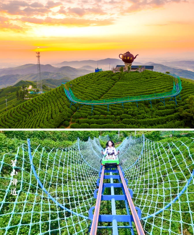 乘坐觀光滑道直達(dá)茶山之頂,舉目四望,山前梯田如鏡,村舍如在畫中,四周峰海山濤、云水煙雨的山水美景,如同一幅幅水墨畫展現(xiàn)在眼前。