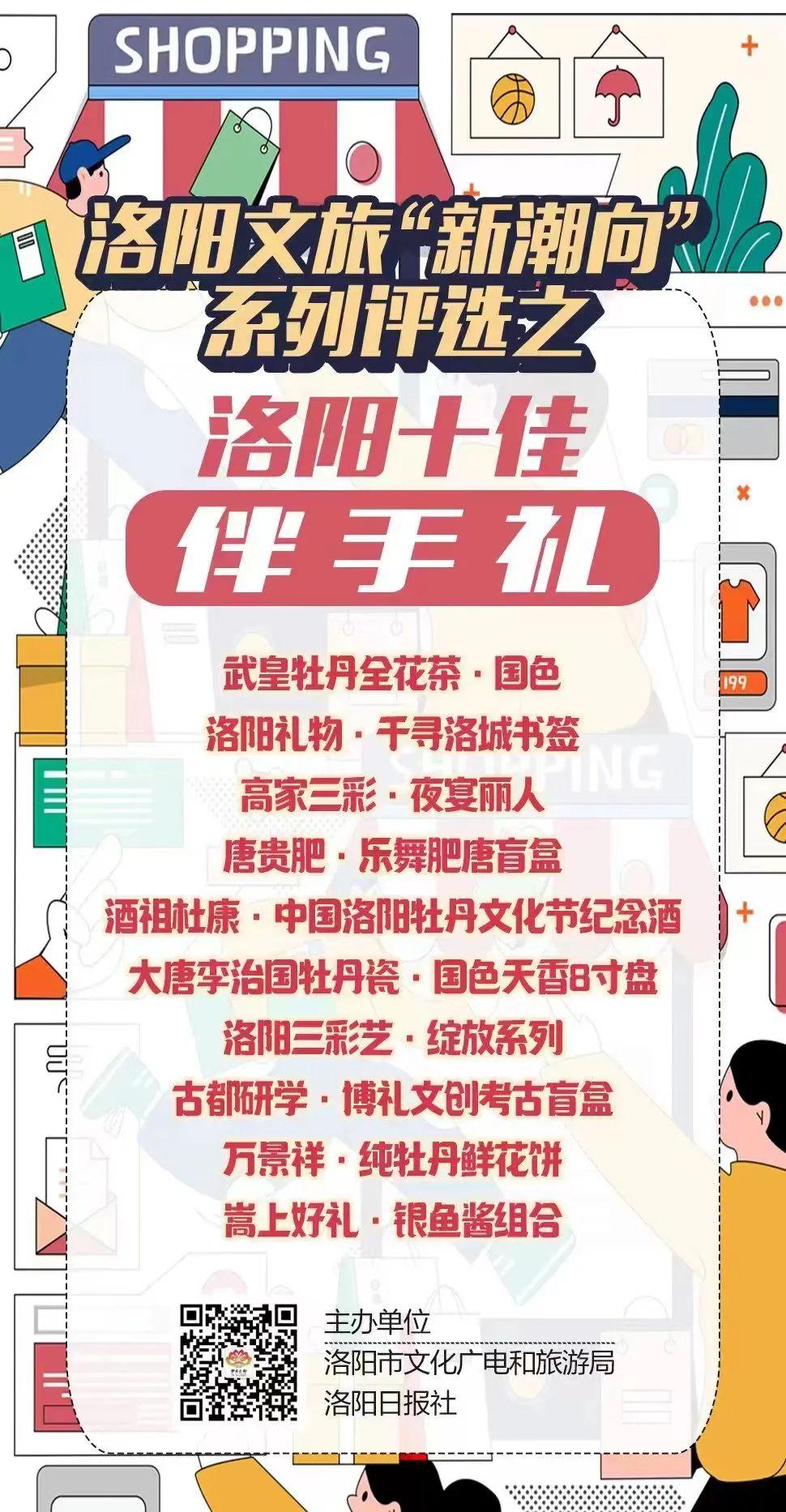 為進(jìn)一步挖掘市場潛力,促進(jìn)文化旅游消費,宣傳和展示洛陽特色地域文化和產(chǎn)品,推進(jìn)本地特色品牌建設(shè),日前,洛陽舉辦了洛陽文旅“新潮向”系列評選活動之洛陽十佳伴手禮評選,40多家企業(yè)100多款產(chǎn)品經(jīng)過選送初審、網(wǎng)上投票、專家評審等多個環(huán)節(jié),最終武皇牡丹全花茶·國色、洛陽禮物·千尋洛城書簽、高家三彩·夜宴麗人、唐貴肥·樂舞肥唐盲盒、酒祖杜康·中國洛陽牡丹文化節(jié)紀(jì)念酒、大唐李治國牡丹瓷·國色天香8寸盤、洛陽三彩藝·綻放系列、古都研學(xué)·博禮文創(chuàng)考古盲盒、萬景祥·純牡丹鮮花餅、嵩上好禮·銀魚醬組合10款產(chǎn)品入圍“洛陽十佳伴手禮”榜單。👏
