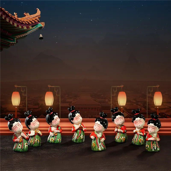 該組樂舞姬由八個不同造型的宮廷樂舞仕女組成,八樂舞姬,開臉圓潤,發(fā)髻高聳,衣著華麗,輕彈演奏,搖曳生姿,或手拿琵琶,或手持排簫,或吹奏長笛,或擊打手鼓,形態(tài)栩栩如生,樂曲余音繞梁,充分映照盛唐歌舞升平的風(fēng)尚氣象。