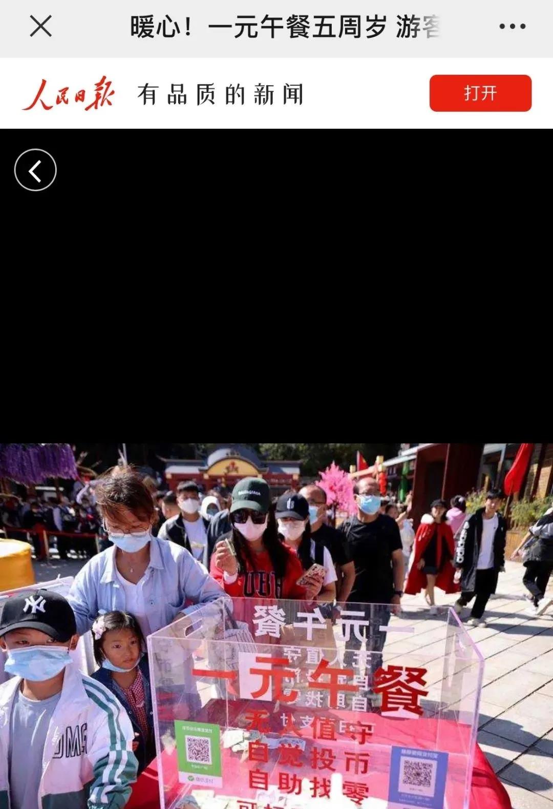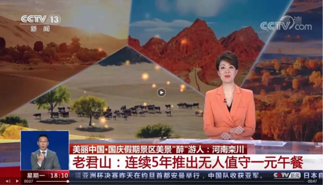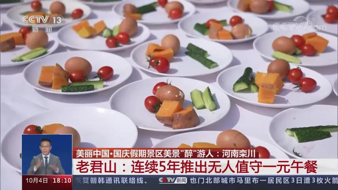 10月4日,央視13套新聞頻道用53秒篇幅重點報道老君山“一元午餐”?紤]到游客用餐不方便,在避免浪費的前提下,老君山景區(qū)連續(xù)五年推出了無人值守的“一元午餐”,廣受游客好評。