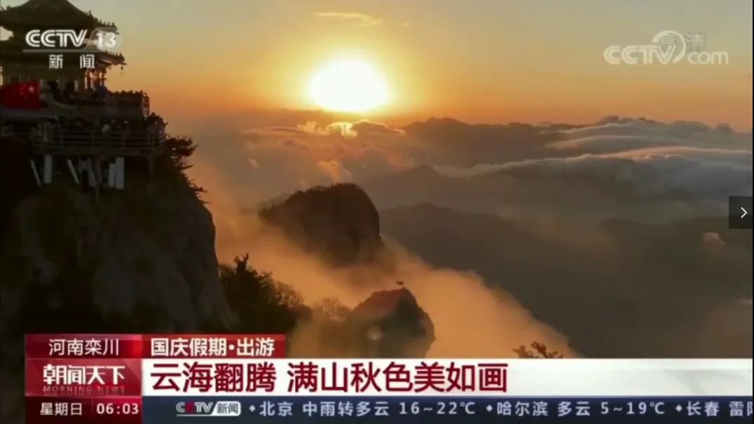10月4日,央視一套綜合頻道《晚間新聞》“可愛的中國”片段中,老君山景區(qū)美景再次出現(xiàn)在視頻畫面中。