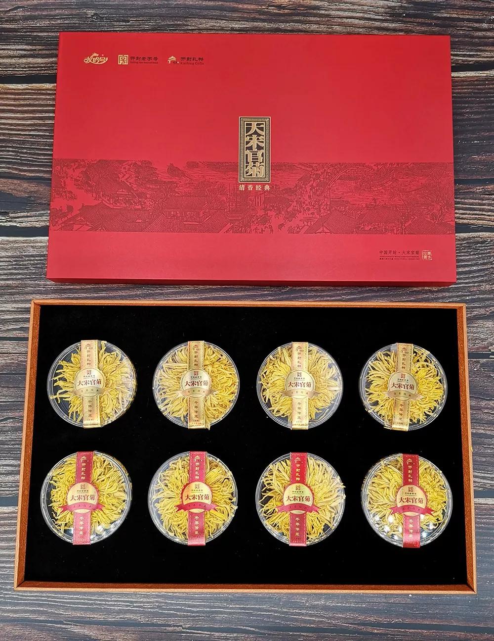 “開封禮物”【芳華】清香型菊花茶,采用開封本地大朵菊花,使用100℃沸水沖泡后,花形千姿百態(tài),口感清甜,潤喉爽口,一朵一杯,清香怡人。產(chǎn)品外包裝采用高檔禮盒,內(nèi)有亞克力水晶盒包裝,一盒內(nèi)含三朵菊花,朵大形美,保鮮安全品質(zhì)看得見。 規(guī)格:3朵*8盒/套,線上線下統(tǒng)一零售價:362元/套