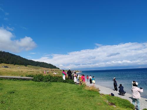 抵達(dá)賽里木湖的那一刻,金春花被眼前的美景震撼。湖水如鏡,倒映著藍(lán)天白云,仿佛一幅精致的畫(huà)作。微風(fēng)拂過(guò),湖面泛起漣漪,清新宜人。