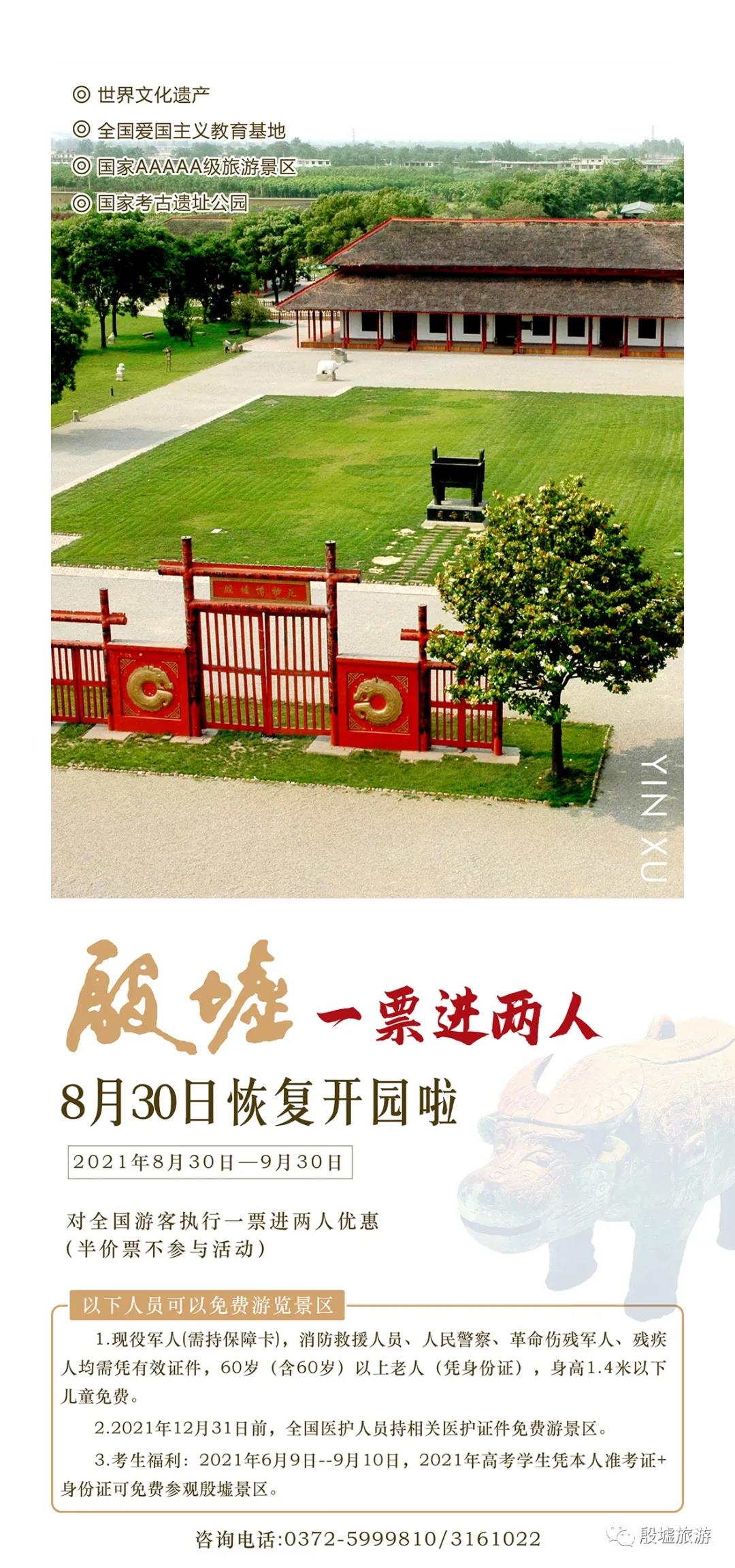 隨著我省疫情得到控制,在嚴(yán)格落實(shí)疫情防控工作的前提下,經(jīng)上級(jí)批準(zhǔn),殷墟景區(qū)于2021年8月30日上午11時(shí)起正式全面恢復(fù)開(kāi)放。歡迎廣大游客前來(lái)參觀游覽。