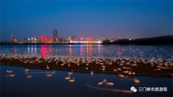 三門峽黃河濕地,特別是三門峽天鵝湖,生態(tài)環(huán)境適合白天鵝生存,為萬只白天鵝云集棲息提供了自然條件。2015年,三門峽天鵝湖創(chuàng)造了野生大天鵝黃河流域自然繁育成功6只天鵝寶寶的奇跡。冬日里,薄霧迷離、水光瀲滟的1800畝天鵝湖水面,5000余只白天鵝水中嬉戲,輕歌低回問夕陽,悠閑舒適舞翩躚。而每年冬天到整個三門峽黃河庫區(qū)濕地越冬的天鵝達上萬只,占全國越冬白天鵝數(shù)量的一半左右。