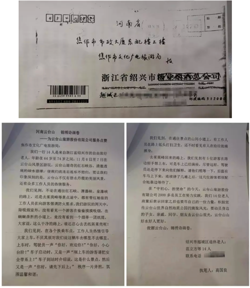 近日,焦作市文化廣電和旅游局收到了一封來(lái)自的特殊信件,信中,14位浙江老人為云臺(tái)山人的優(yōu)質(zhì)服務(wù)點(diǎn)贊!