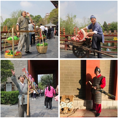 “新鮮的蔬菜水果嘍”,“磨剪子嘞戧菜刀”……沒準你還沉浸在精致的壁畫中,一慌神的功夫,各種情景演員就出現(xiàn)在你面前了。一時間叫賣聲此起彼伏,他們好像有種魔力,能把你拉回到北宋熱鬧的市井街頭。