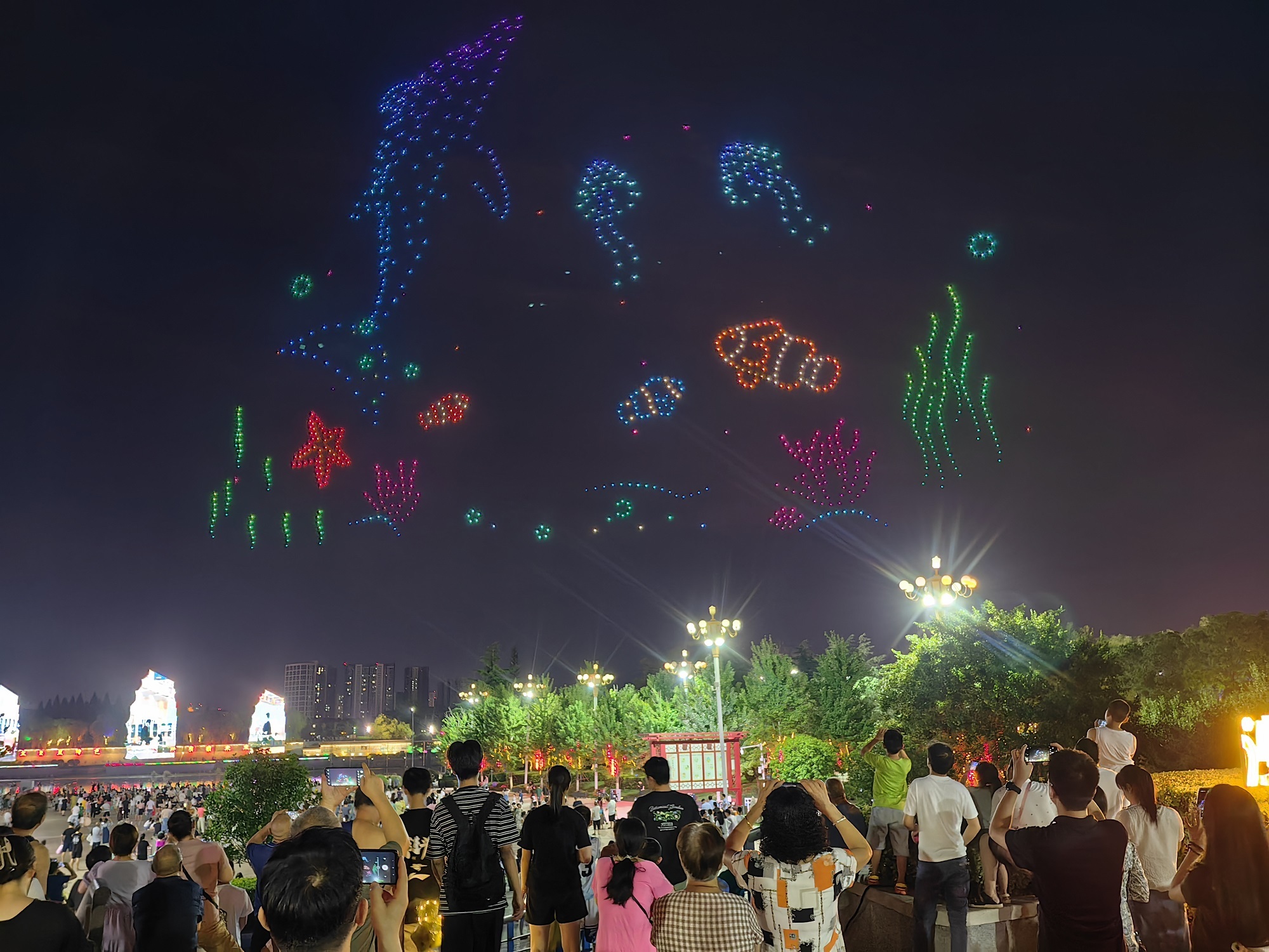 沙澧河風(fēng)景區(qū)紅楓廣場(chǎng)舉行的“只有漯河”無(wú)人機(jī)表演 齊國(guó)霞 攝