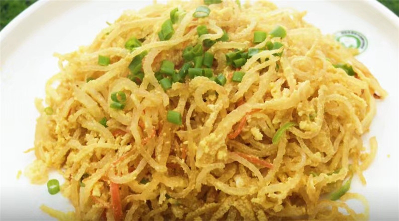 皮絲涼調(diào)味道偏脆,炒制口感更彈,烹制好的皮絲色澤金黃,清脆可口,有補血益氣、美容養(yǎng)顏的功效。賈德杰不僅擅長傳統(tǒng)的皮絲制作,更善于推陳出新,在探索中研發(fā)以皮絲為原料的新菜品,對松花皮絲、涼拌皮絲、皮絲丸子、皮絲糕等菜品都有自己的理解和做法,多種多樣皮絲佳肴的出現(xiàn),少不了他的銳意創(chuàng)新。