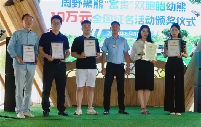 現(xiàn)場(chǎng),獲獎(jiǎng)人朱先生激動(dòng)萬分地說道,感謝周口野生動(dòng)物世界給予我這份殊榮,讓我有幸獲得黑熊“富貴”雙胞胎幼熊的全國(guó)征名活動(dòng)大獎(jiǎng),獲得十萬元現(xiàn)金獎(jiǎng)勵(lì),并成為周憨和周萌的榮譽(yù)認(rèn)養(yǎng)人。