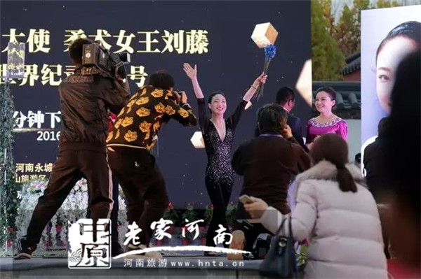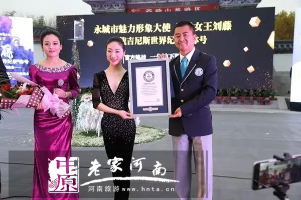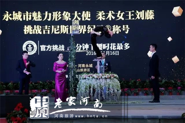 11月16日下午,永城市魅力形象大使、中國“柔術女王”劉藤在芒碭山旅游區(qū)成功挑戰(zhàn)一分鐘下腰叼花最多吉尼斯世界紀錄。在當天的挑戰(zhàn)環(huán)節(jié)中,劉藤以一分鐘下腰叼花15支成功打破其2015年保持的“一分鐘反折身體下腰叼花11支”的吉尼斯世界紀錄。