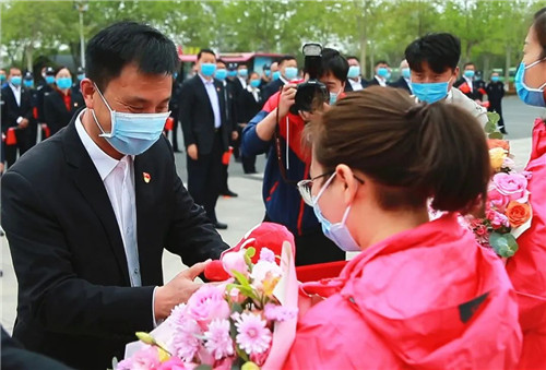 焦作市衛(wèi)生健康委主任楊吉喜向援鄂醫(yī)療隊(duì)全體隊(duì)員贈(zèng)送鮮花▼