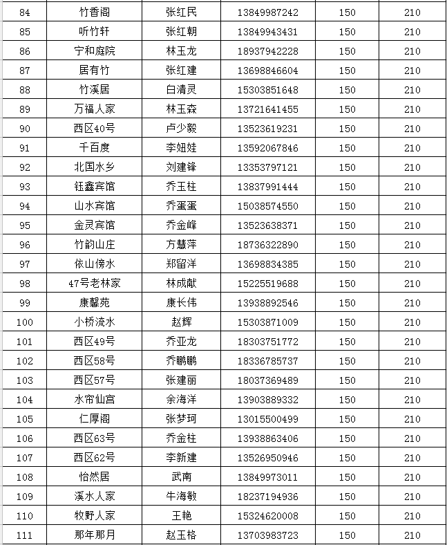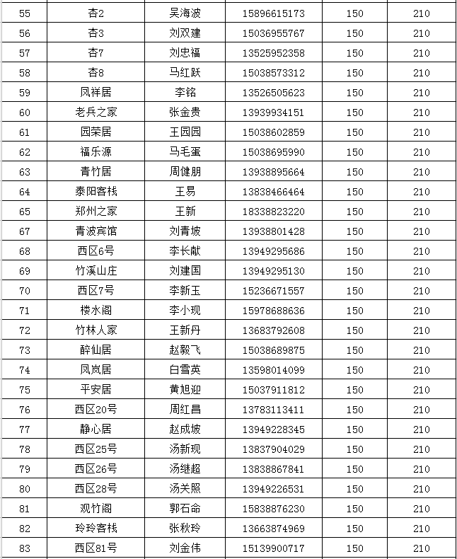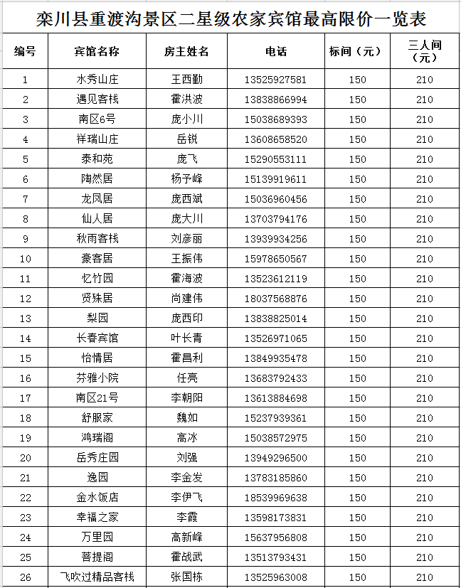 欒川縣重渡溝景區(qū)二星農(nóng)家賓館最高限價(jià)一覽表: