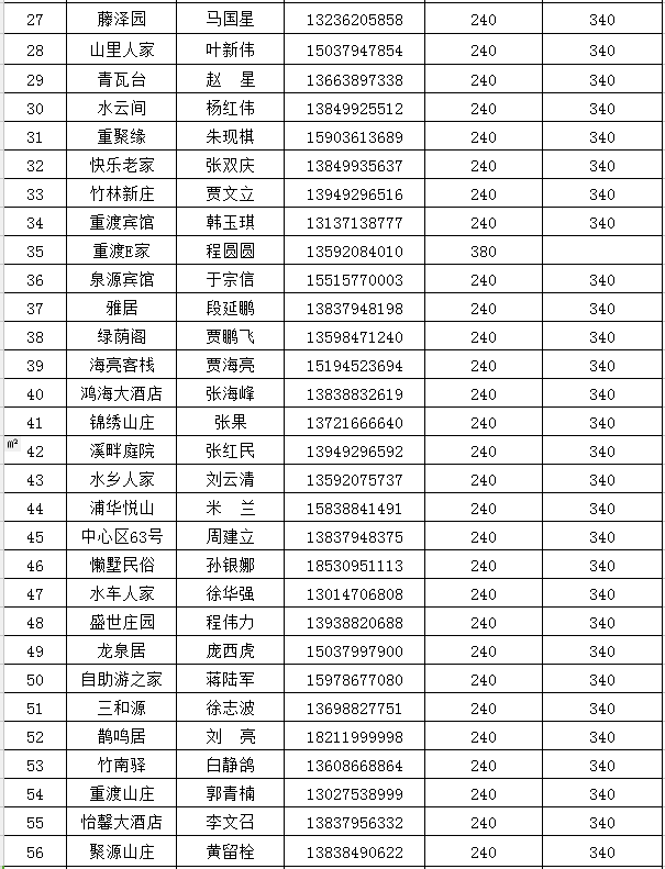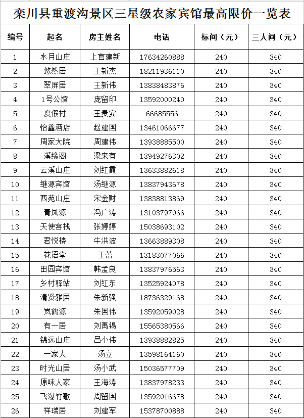 欒川縣重渡溝景區(qū)三星農(nóng)家賓館最高限價(jià)一覽表: