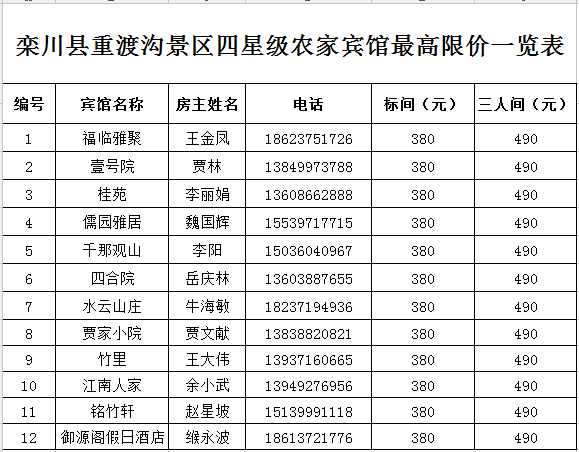欒川縣重渡溝景區(qū)四星農(nóng)家賓館最高限價一覽表: