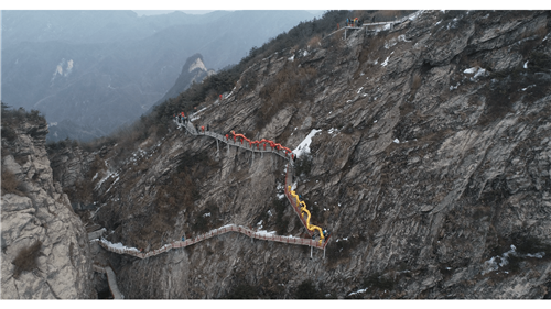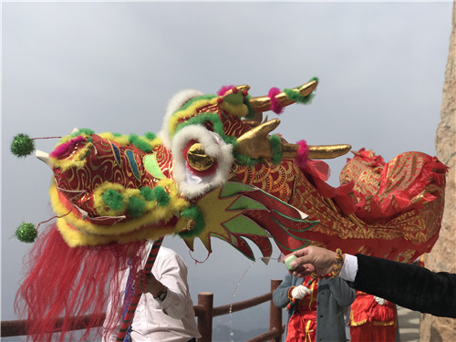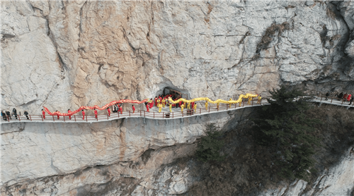 農(nóng)歷二月二,民間俗稱“龍?zhí)ь^”。當日,洛陽欒川當?shù)孛癖娫邶堄鵀尘皡^(qū)懸崖絕壁間上演舞龍祈;顒。巨龍伴著鑼鼓聲在陡峭的懸崖峭壁間時而俯首而沖,時而一字前行,時而二龍戲珠,上下飛舞,盤旋與海拔2222.5米中原第一峰雞角尖,甚為壯觀,吸引了一批當?shù)孛癖姾屯鈦碛慰婉v足觀看。