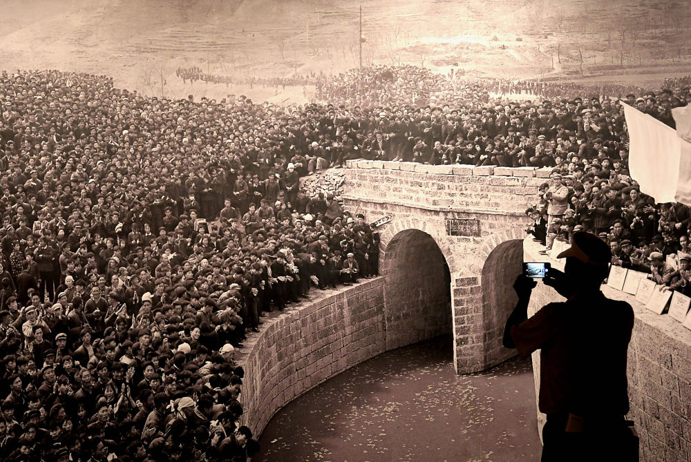 參觀者在紅旗渠紀(jì)念館拍攝展出的紅旗渠通水慶典照片(2019年7月4日攝)。新華社記者 李安 攝