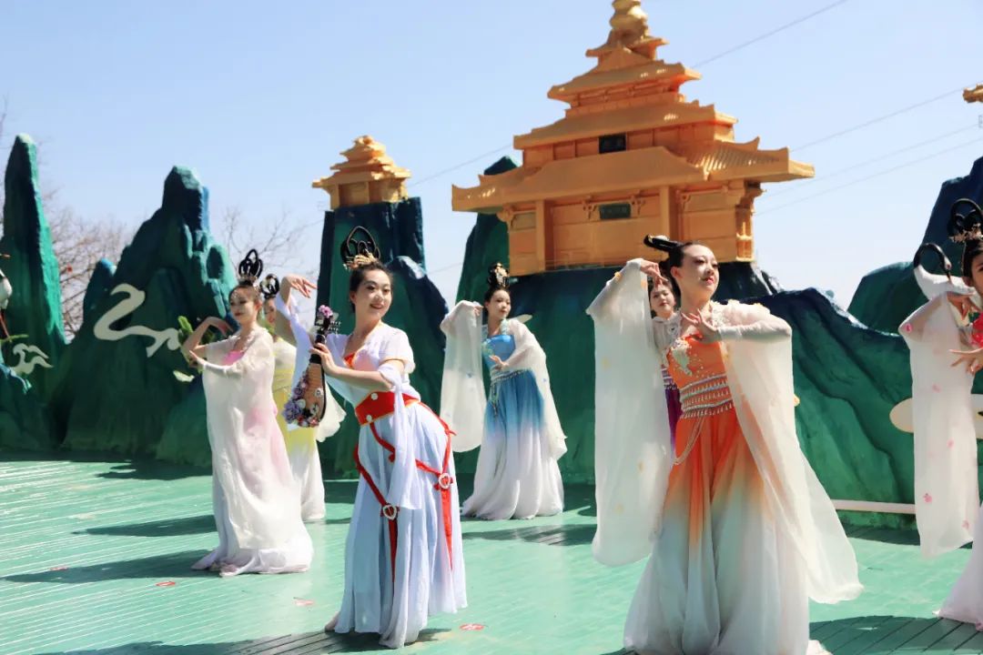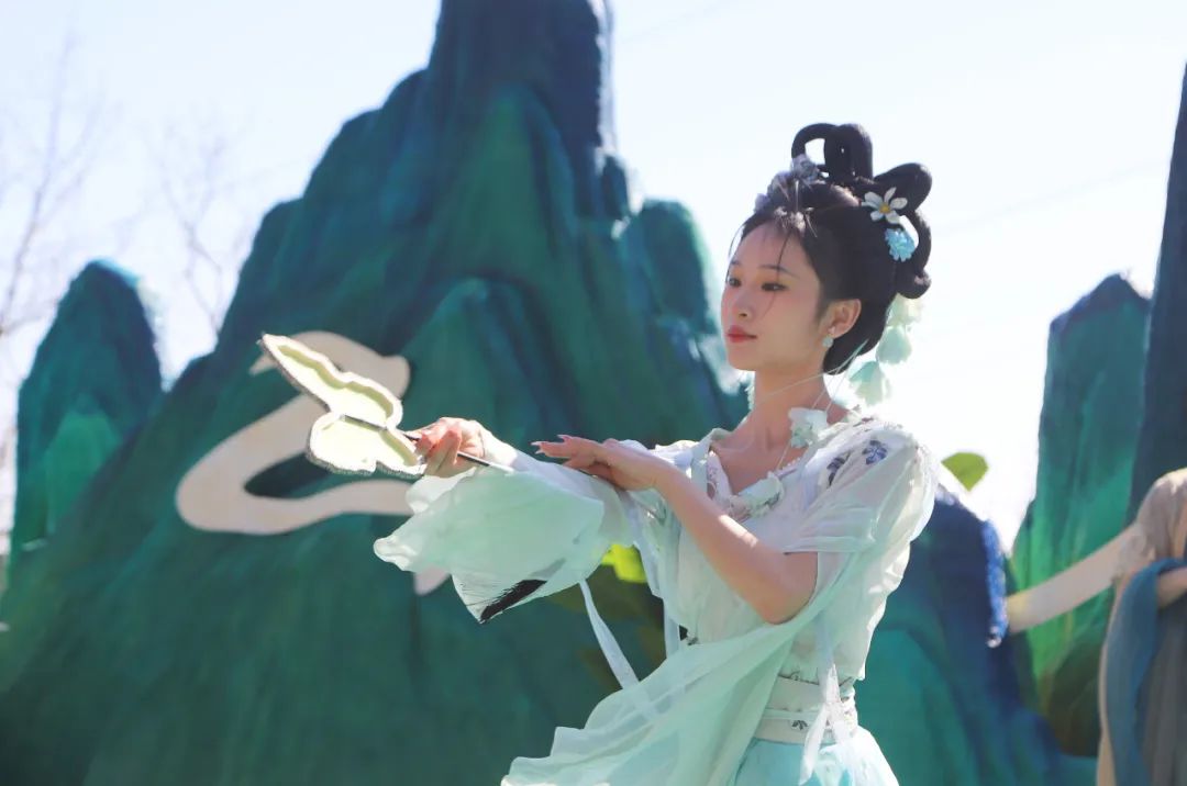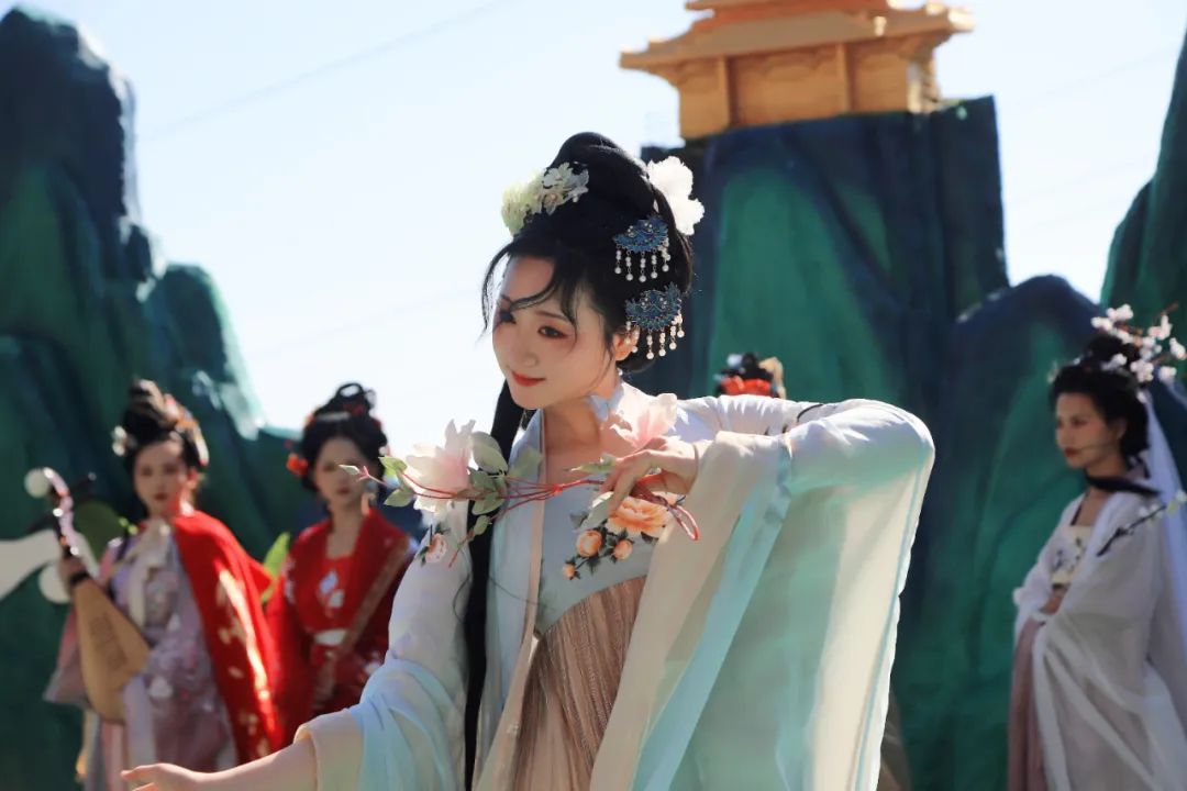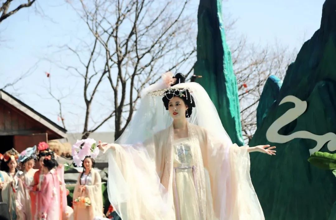 她們手持花枝,在花海之中淺步輕盈,將代表著希望與祝福的香囊福袋、幸運(yùn)符拋撒,傳遞著對春天和未來的美好祈愿!