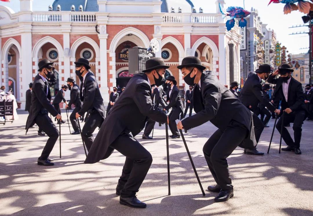 禮帽、胡子、燕尾服、拐杖、皮鞋、八字步,你可能見過卓別林模仿秀,但你見過幾百個卓別林同時秀嗎?,驗票處、節(jié)目中、商鋪里……卓別林們隨時用最可愛的招式歡迎你。