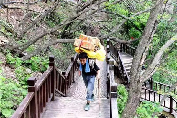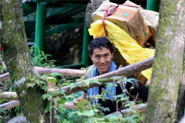 山上的道路很多不是臺階就是絕壁棧道,對于一個身上背著一百多斤貨物的人來說走起來尤其的困難,更不必說是一個只有一只胳膊的背山工,但是他仍能不辭辛苦的堅持著,只要有活干,心里就感到滿足,有時候白天干完,晚上還會去加班背,一干就干到次日凌晨1點多鐘,有時天不亮就開始往山上背東西。