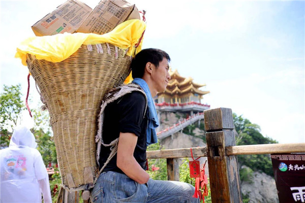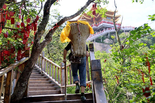 像楊文超這樣的背山工,老君山上還有很多,在索道未建成的年代里,廟宇維修、賓館改造、索道建設,一磚一瓦,材料設備,都須背上山。他們負重前行,背起的不僅是貨物和對進山游客的責任,也是對自己家庭的責任。