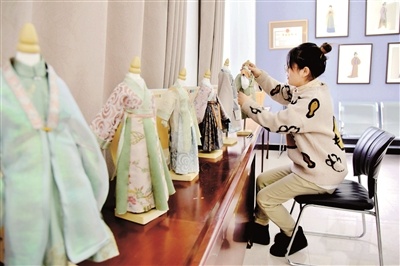 “其中一部分漢服的布料,是我們利用傳統(tǒng)染色工藝自制的,這樣才能讓漢服的質(zhì)感、顏色等與歷史原物達(dá)到統(tǒng)一,更好地體現(xiàn)其歷史和文化內(nèi)涵。”韓林芳說,她曾帶隊前往外地進(jìn)修,學(xué)習(xí)藍(lán)染、扎染、蠟染等非遺技藝,為制作迷你漢服打下了良好基礎(chǔ)。