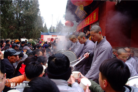 2018年1月24日,農(nóng)歷丁酉年臘月初八,欣逢釋迦牟尼佛成道紀念日,“臘八節(jié)施粥法會”在少林寺山門前舉辦。上午九點,少林藥局延琳法師帶領(lǐng)四眾弟子拈香禮佛,誦經(jīng)祈福,隨后,數(shù)千信眾、游人排隊接受施粥。此次法會意在傳遞佛教平等慈悲、圓融感恩的理念,弘揚中華傳統(tǒng)民俗文化。
