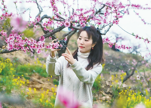 游客在魯山縣下湯鎮(zhèn)林樓村萬畝桃園賞花拍照 馬進偉 攝
