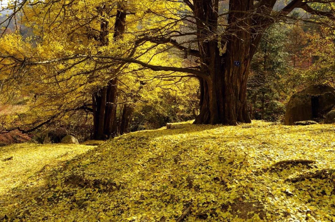 洛陽白云山腳下的五馬寺銀杏樹林,樹齡之古老,分布之集中,實屬罕見,具有很高的科研及觀賞價值。這里有30株樹齡超千年,最大樹齡2300多年的古銀杏林,400余株500年以上樹齡的銀杏群,它們冠大蔭濃,燦若披錦,銀杏樹冠總面積超15300平方米。10月下旬至11月上旬是銀杏的最佳觀賞季節(jié),秋風(fēng)一吹,銀杏葉緩慢飄落,落得滿地金黃,一幢幢黃泥土墻粼粼灰瓦的老屋,掩映在高飽和度的色彩世界里。