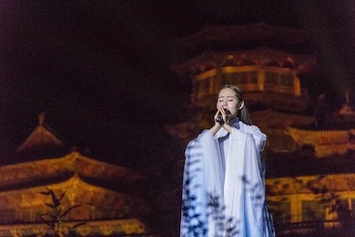 2017年,姜姿伢來到中岳嵩山大型山地實景演出《禪宗少林·音樂大典》,并在演出現(xiàn)場傾情獻唱。靜坐于嵩山峽谷中的蒲團之上,皓月當空,溪水叮咚、蟬鳴蟲叫,感悟著裊裊禪樂,再配以姜姿伢空靈淡雅的嗓音,頓覺心神空明、內(nèi)心寧靜,仿若與這片自然融為一體。