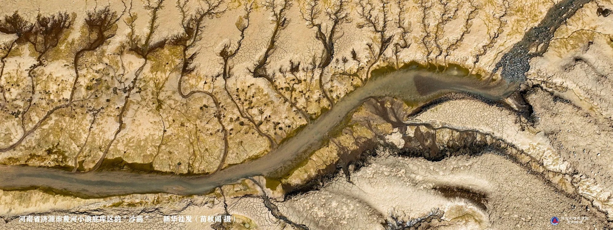 每年黃河小浪底水利樞紐調(diào)水調(diào)沙后,庫區(qū)水位下降,大面積河床裸露出水面,河水在河床上沖刷留下的痕跡,形成黃河“沙畫”,鬼斧神工,令人叫絕。