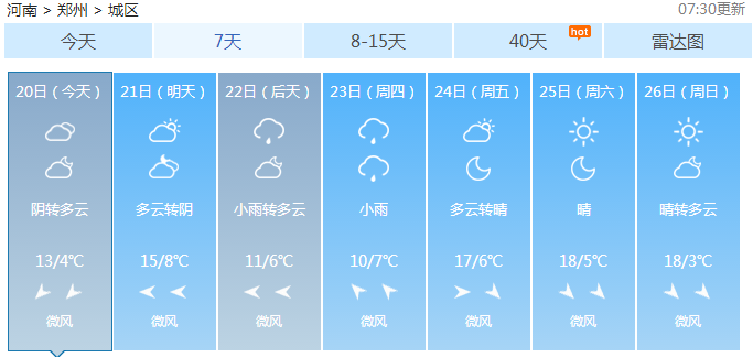 據(jù)省氣象臺(tái)預(yù)測(cè),今天白天,河南省內(nèi)京廣線以東小雨逐漸停止轉(zhuǎn)陰天;其他地區(qū)陰天轉(zhuǎn)多云。全省偏東風(fēng)2到3級(jí)。全省最低氣溫為4℃~6℃,最高氣溫13℃~15℃。