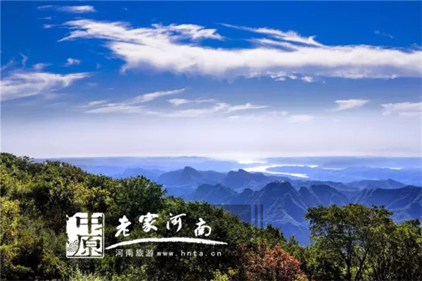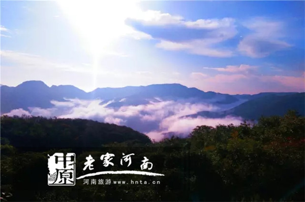 也許是厭倦了陰雨天里那一套“云霧縹緲”的“裝束”,今日,她換了一身“藍(lán)天白云”的紗裙,秋風(fēng)和煦、日暖生煙,群山在連綿起伏中微微露出朦朧的面龐和瀟灑不羈的矯健身姿,山間滔滔水聲滾滾流淌耳邊,像是醉臥山谷里的蓋世英雄,帶著千軍萬(wàn)馬的雄風(fēng),穿山而來(lái)!