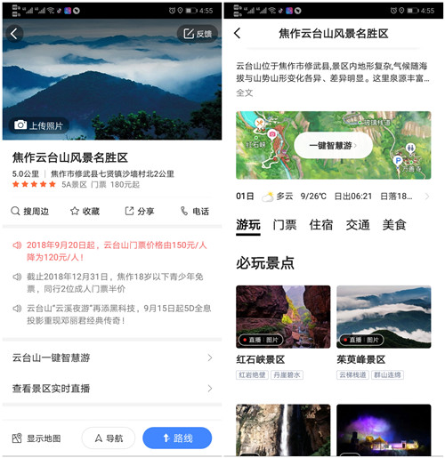 游覽前,游客在高德地圖搜索云臺山,可一鍵直達(dá)“景區(qū)門戶”,不僅能查詢交通,還可以在線購票、訂酒店、查看景區(qū)最新動態(tài);游覽中,游客點擊“一鍵智慧游”,進(jìn)入云臺山手繪導(dǎo)覽圖,不需要再尋人問路,就可以找到多種個性化游覽線路、明星語音導(dǎo)游、停車場、乘車點、最佳拍照點、廁所、醫(yī)務(wù)室、餐廳等等,發(fā)生緊急情況可點擊“一鍵呼救”,快速尋求工作人員幫助;游覽結(jié)束后,游客可針對景區(qū)發(fā)表游記和評論,供更多游客參閱。同時,“智能云臺山”管理系統(tǒng),可及時了解景區(qū)周邊高速、省道路況信息,協(xié)調(diào)交警做好景區(qū)外圍交通管制與疏導(dǎo);24小時監(jiān)控全方位覆蓋景區(qū),及時應(yīng)對各種突發(fā)事件。