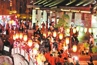 洛邑古城推出的唐風(fēng)市集夜游場(chǎng)景成為漢服約拍的網(wǎng)紅打卡地。洛邑古城供圖