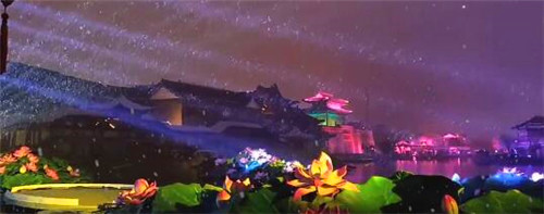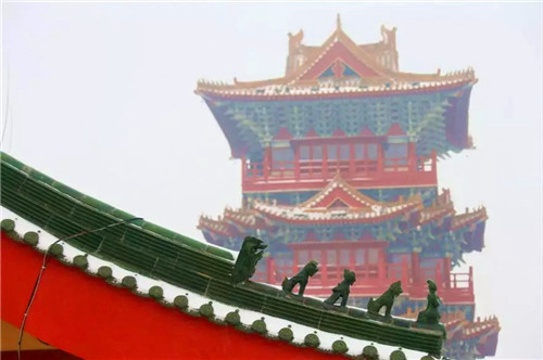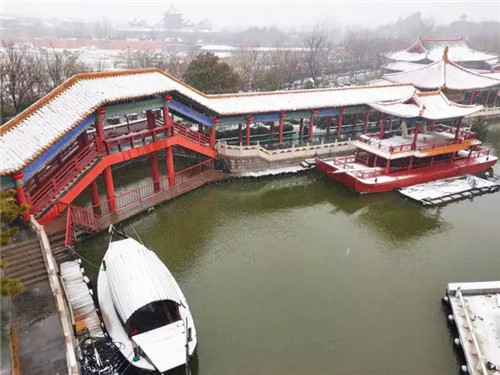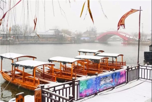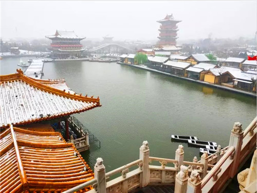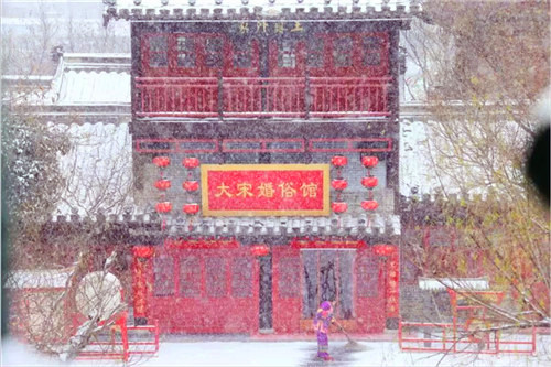 雪中的清明上河園,粉雕玉琢,碧樹凝珂。古風的建筑在雪中個個都是白衣勝雪的模樣。