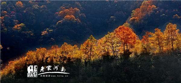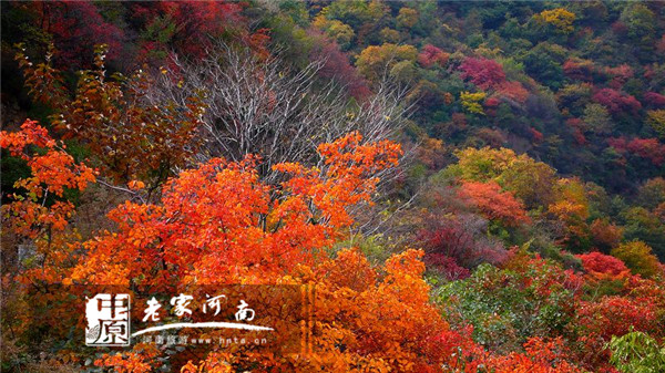 “女媧神話之鄉(xiāng)”小溝背景區(qū),華北地區(qū)唯一遺存的原始森林腹地。深秋季節(jié)的銀河峽,秋山明凈面如妝,山谷中的楓樹、橡樹、黃櫨等有色樹種爭(zhēng)奇斗艷,漫山紅葉、金葉層林盡染、五彩斑斕,宛如巨幅天然油畫。