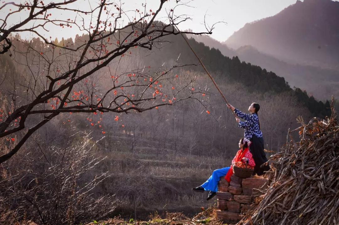 你忍住,不愿去摘她,更愿她停在枝頭,多待一會(huì)兒,裝點(diǎn)一下這蕭瑟黯淡的初冬,可你又忍不住,忍不住想去觸碰。她那被霜打的皮,那珠紅般的光澤,像極了羞答答的少女,你忍不住、想把這可人的小東西,輕輕一握,捧在手里。