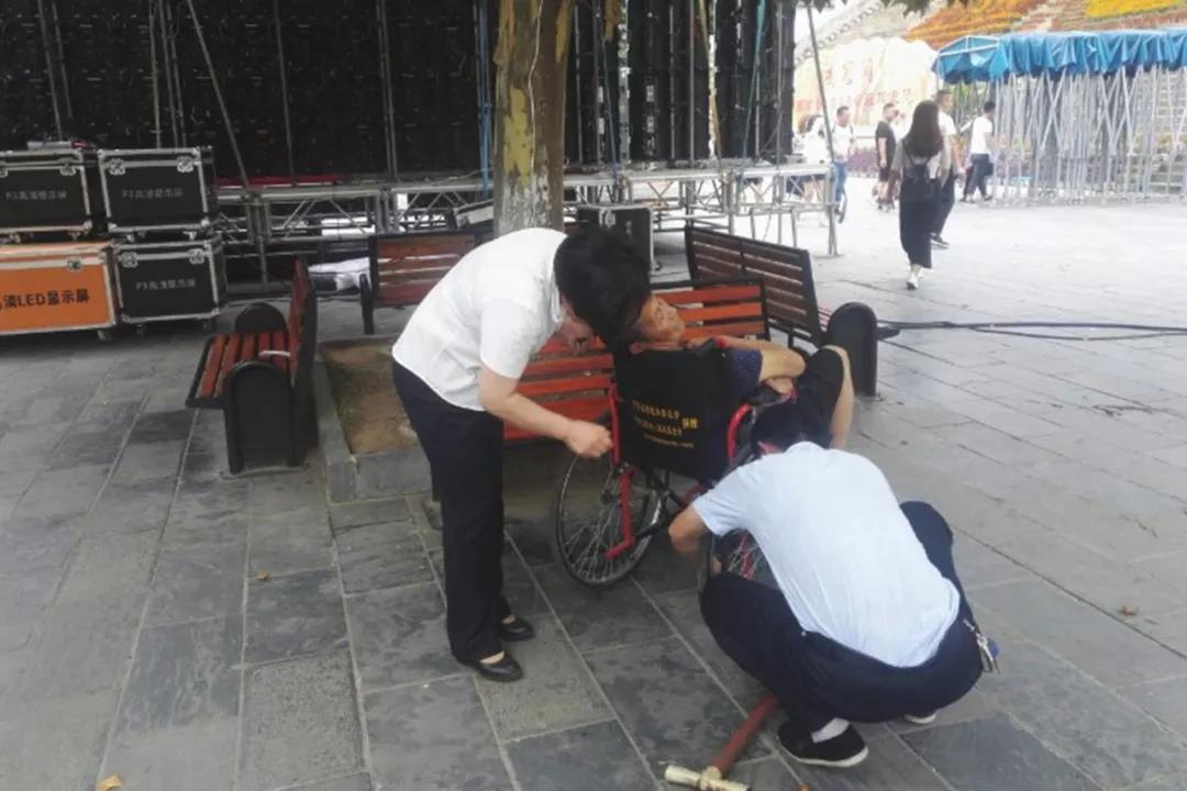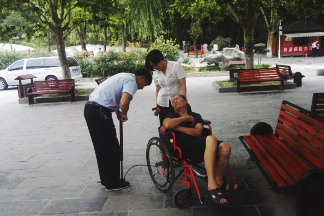 突然,他們發(fā)現(xiàn)人群中有一個(gè)老太太神情慌張的尋找著什么,在他身邊還有一個(gè)身坐輪椅的老大爺。莘麗娜和同事立馬跑上前詢(xún)問(wèn)是否需要幫忙。原來(lái)是來(lái)自嵩縣的李大媽推著坐輪椅的老伴一起來(lái)旅游,但是從停車(chē)場(chǎng)到這邊剛走一段輪椅輪胎沒(méi)氣,走不了路了。