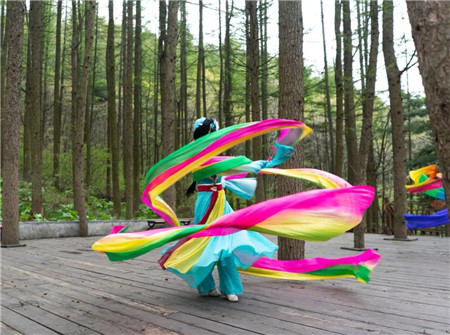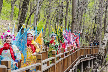 龍峪灣里林籟泉韻,風光旖旎,多位優(yōu)秀戲曲家在如畫風景中,一展藝術風采。經典的戲曲劇目、響遏行云的優(yōu)美唱腔、精致華麗的服飾裝扮以及輕盈穩(wěn)健的臺步,在龍峪灣森林氧吧中顯得更加迷人多彩,引來眾多游客駐足觀看,或拍照或輕聲哼唱,好不熱鬧。