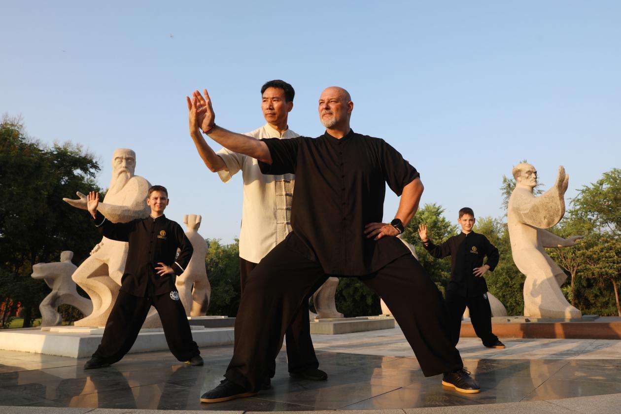 太極拳名家陳炳在指導羅馬尼亞學員多羅父子三人練習太極拳 張昊 攝