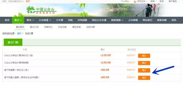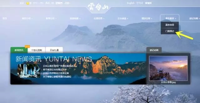 1、打開云臺山官方網(wǎng)站,選擇門票預(yù)訂
