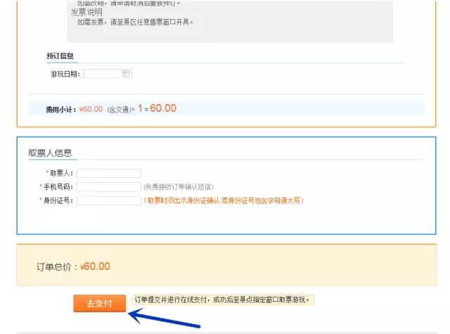 3、填寫相應(yīng)信息,點(diǎn)擊“去支付”按鈕,完成門票預(yù)訂