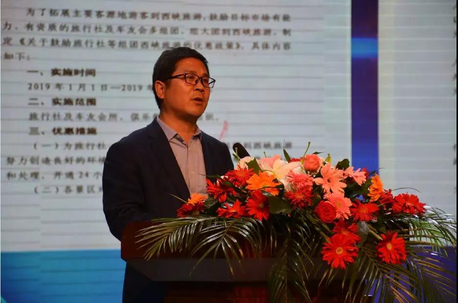 西峽縣文化廣電和旅游局局長萬方宣讀《關(guān)于獎勵2019年度組團旅行社的決定》