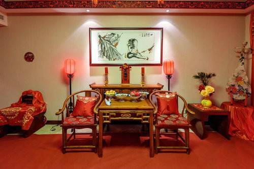 大紅基調(diào)為底,瓷瓶桃花、文房四寶、剪紙刺繡、素雅屏風(fēng)點(diǎn)綴其中,一間豪華的現(xiàn)代五星套房瞬間化身為質(zhì)樸典雅的漢式婚房。精心布置這間婚房是為迎接一對(duì)來(lái)自瑞典的華僑金婚夫婦,他們漂洋過(guò)海、遠(yuǎn)道而來(lái),是為參加寶豐酒(丁酉)“佛光七夕 漢風(fēng)古韻”大型集體婚禮。