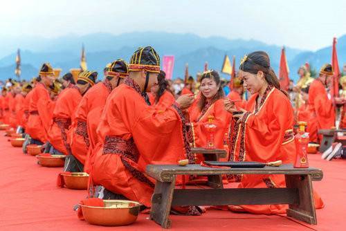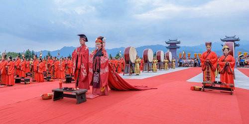 婚禮現(xiàn)場,氣勢恢宏,場面壯觀;槎Y分為《開禮篇》《主禮篇》、《贊禮篇》三部分,采用古典婚禮的儀式與場景,再現(xiàn)漢代禮樂與婚慶文化。近百對(duì)新人,30位旗手、12位鼓手、15位舞者、6位侍女,在大主禮司、大領(lǐng)禮司、執(zhí)禮官帶領(lǐng)下,在6對(duì)金婚老人的見證下,伴隨著古樸典雅的音樂,典禮開始,《開禮篇》以華章呈現(xiàn)、盛世起舞開篇,再現(xiàn)古風(fēng)古韻之魅力;《主禮篇》分為雅樂起鼓(鼓樂齊奏,盡顯漢風(fēng)威儀)、盛世宣召(華章贊頌,禮樂相和,旗幡招展)、新人召進(jìn)(君子翩翩,裙帶華簪,以禮而入)、正衣肅顏(敬畏天地,文化彰顯)、沃盥禮敬(凈手素面,禮敬先賢)、對(duì)席起禮(長案對(duì)坐,四目期盼)、同牢合巹(三牢而食合巹而飲同甘共苦比翼齊肩)、交拜成儀(夫婦交拜,互敬款款)、解纓結(jié)發(fā)(結(jié)發(fā)成儀,夫婦百年)、執(zhí)手禮成(執(zhí)子之手,與子偕老)等十個(gè)環(huán)節(jié),無一不體現(xiàn)漢式傳統(tǒng)婚典文化的獨(dú)特魅力!