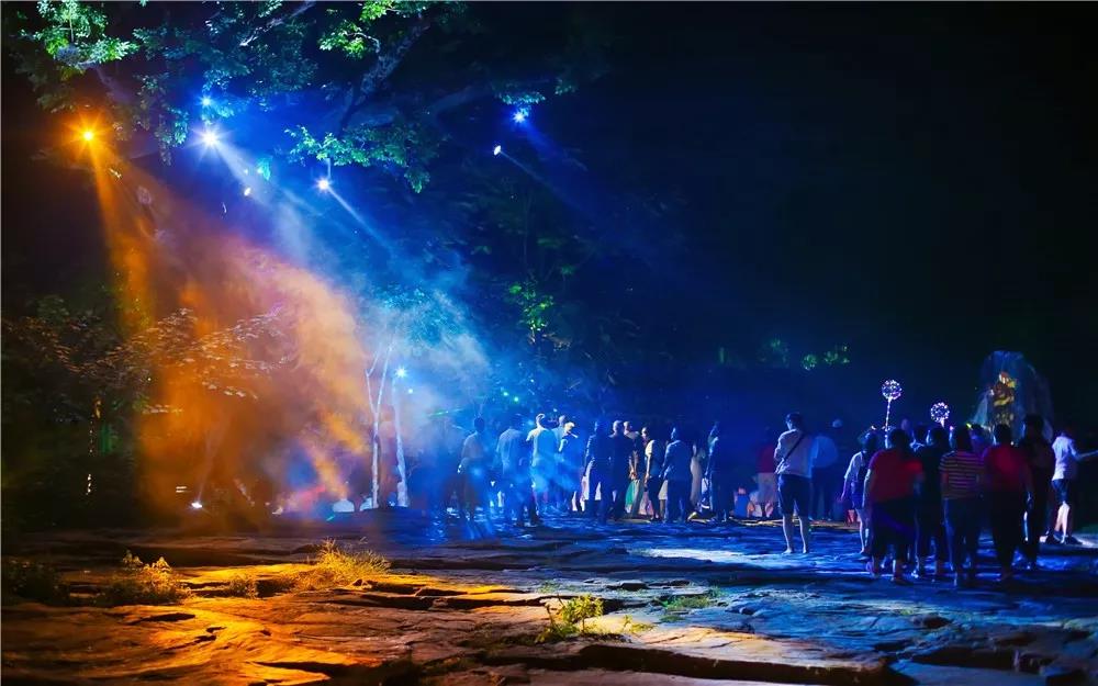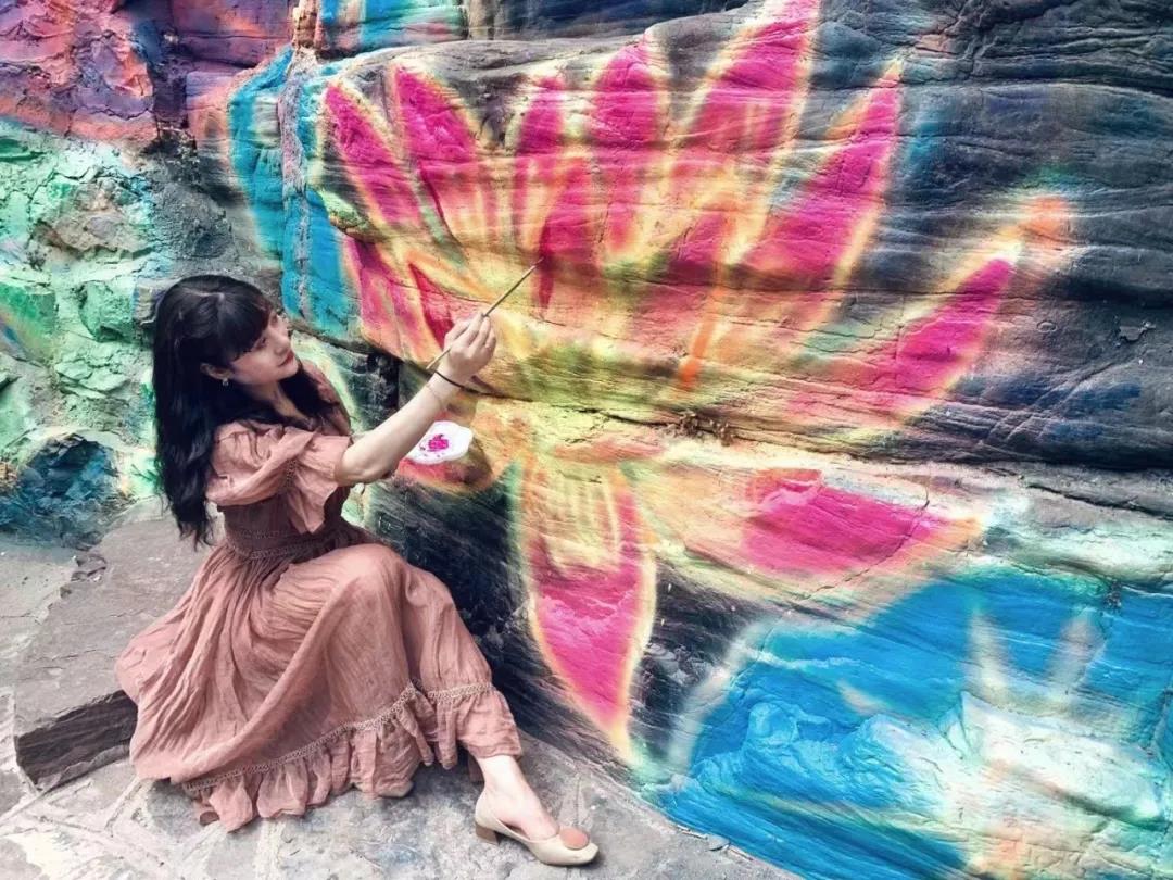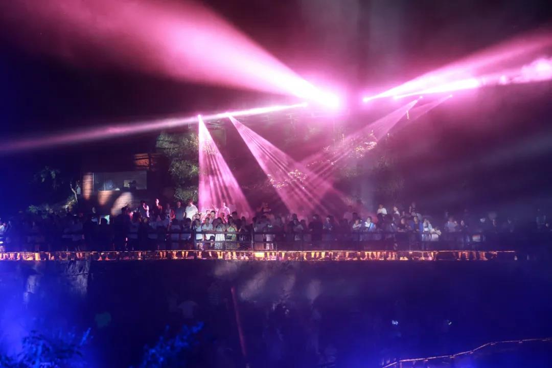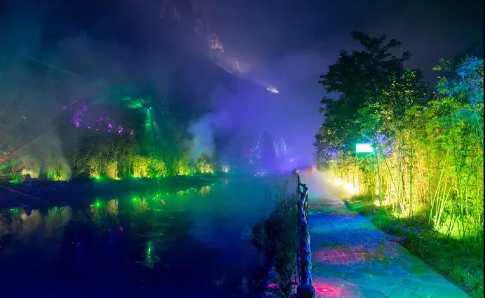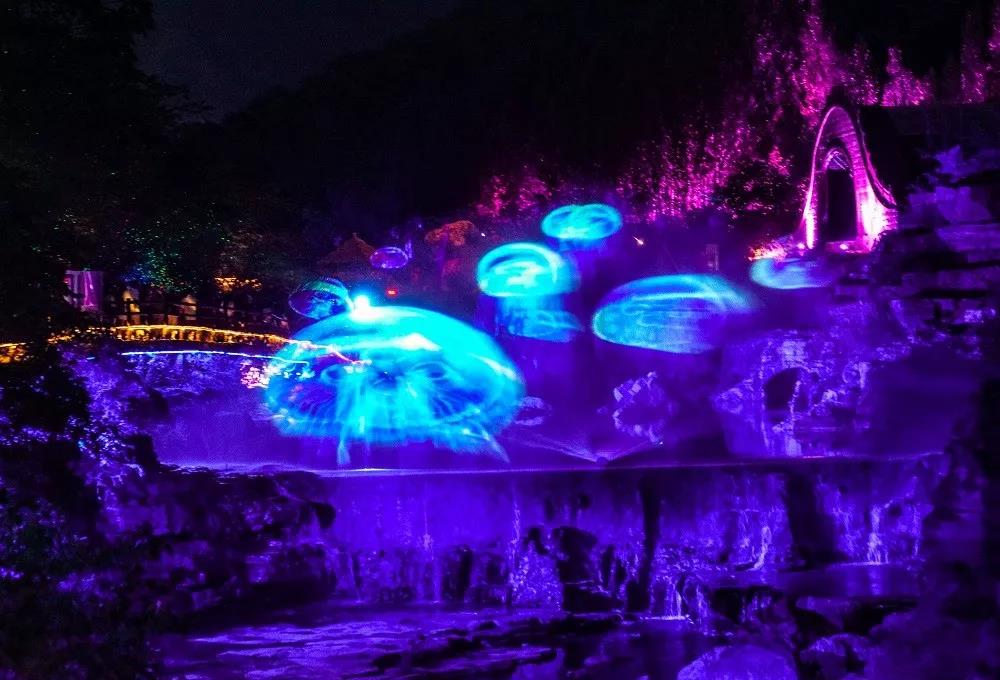 蓮花開在巖壁上,星空閃爍在河道里。穿過一陣水霧,繪制好的熒光畫熠熠生輝,散發(fā)著浪漫的氣息……