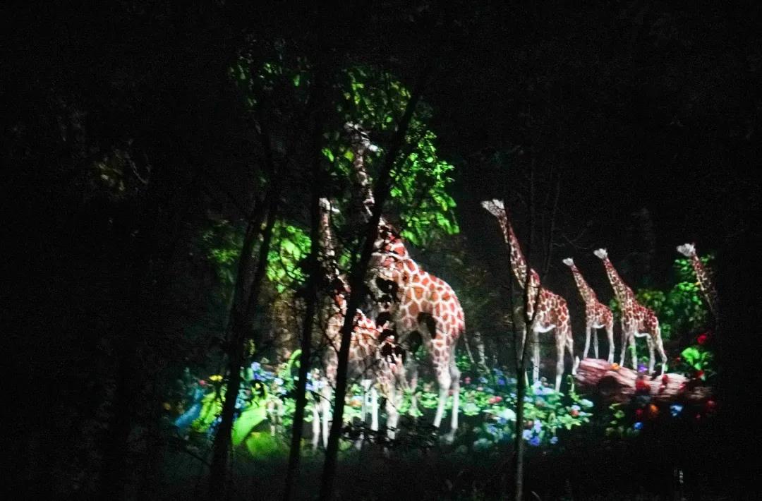魚在空中游,人在畫中走。夜色來臨,光影交匯,游人探入“原始森林”、潛入“汪洋大海”探尋著動物們的奇妙世界……