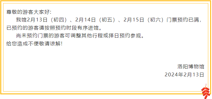 【溫馨提醒】洛陽(yáng)博物館2月13日(初四)、2月14日(初五)、2月15日(初六)預(yù)約已滿