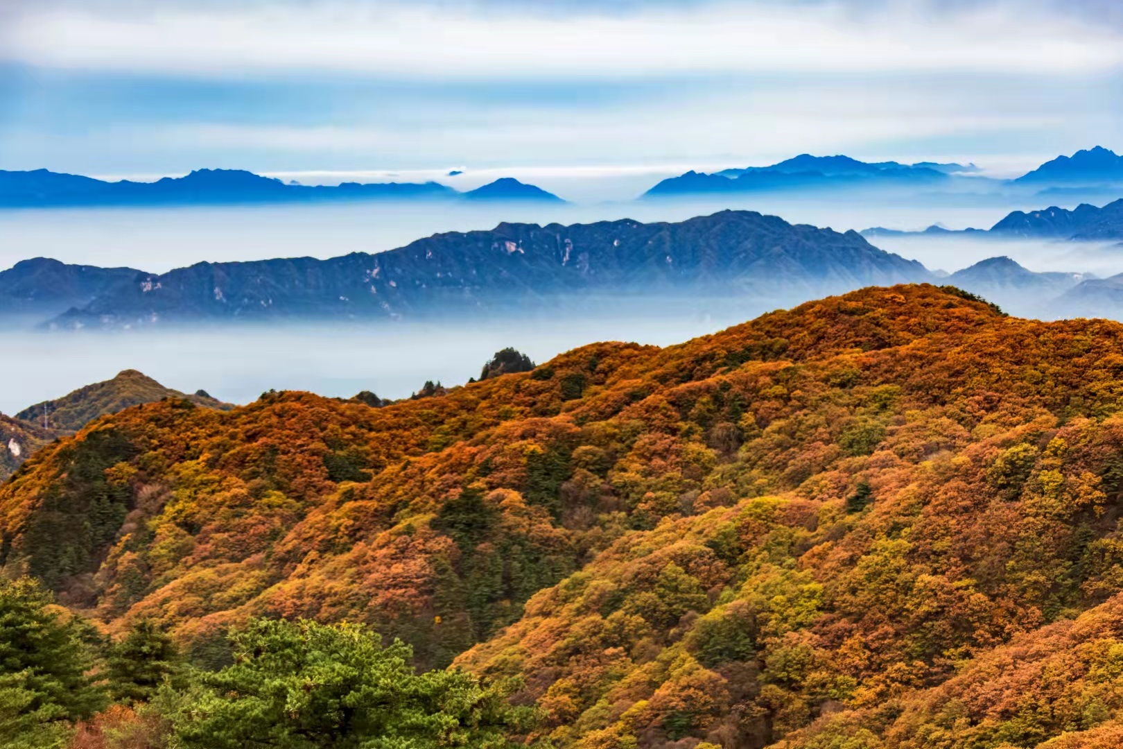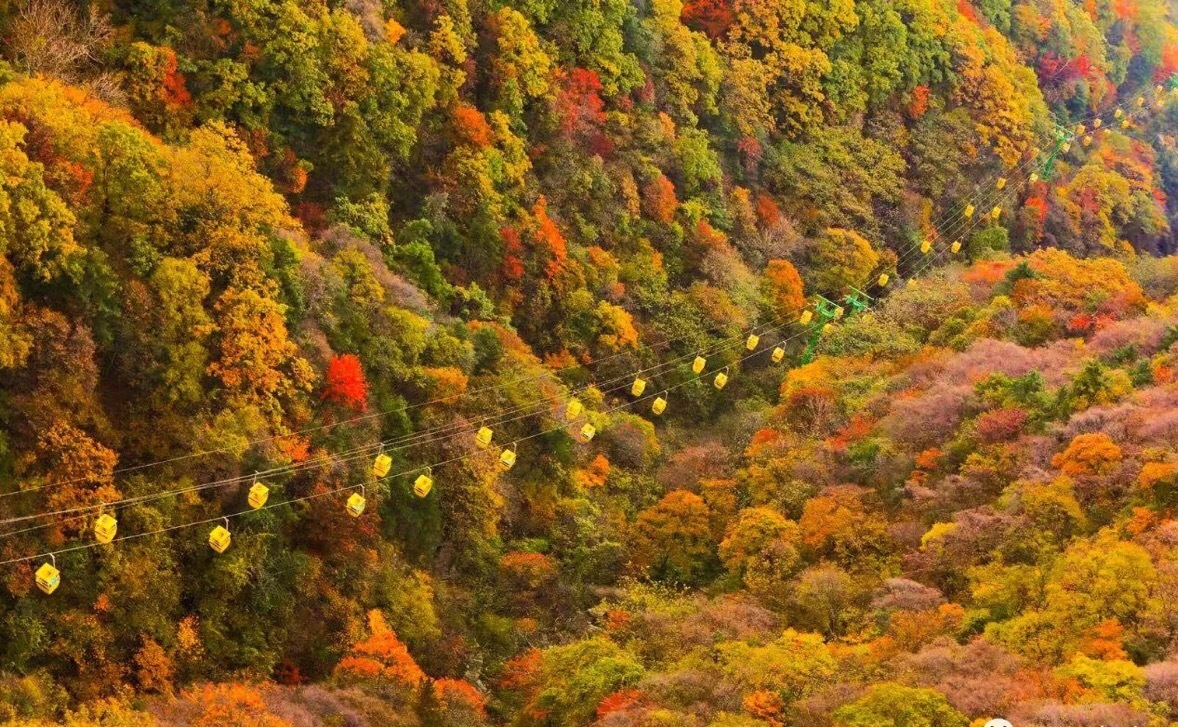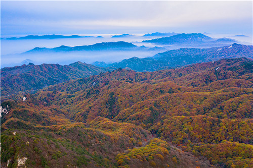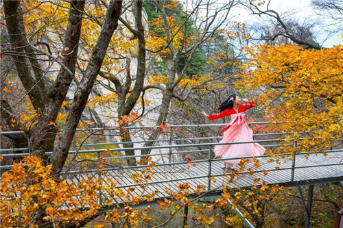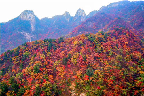 化身秋日林間的精靈,感受穿越攀行的快樂,尋找堯山楓韻的色彩。拾級而上,山巒環(huán)抱的山坳里、溝谷中、瀑布旁,一團團一簇簇,或紅或橘,或黃或綠,令人陶醉。踏上玉皇頂極目遠眺,八百里伏牛秋色盡收眼底。